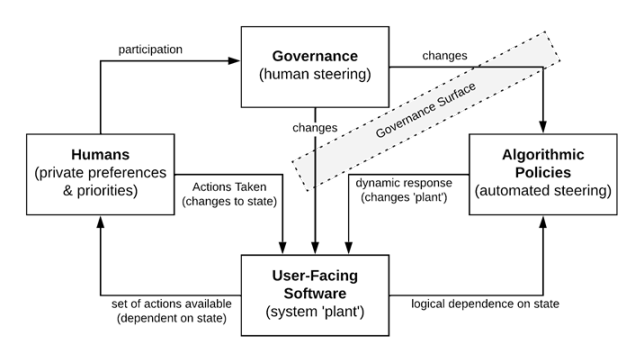 因此,治理面的使用不能以纯粹的客观条件进行评估。当组织有明确的目标时,只有事后才能评估该决定是否促进了该目标。基于观察到的结果的迭代决策的正式研究称为反馈控制[36]。术语“治理面”是“控制面”的变体,控制面是指可以直接受反馈控制系统中决策软件影响的变量。在第4节中,来自反馈控制的核心概念被探索为理解组织为实现其目的而运用其治理面的方式的一种手段。