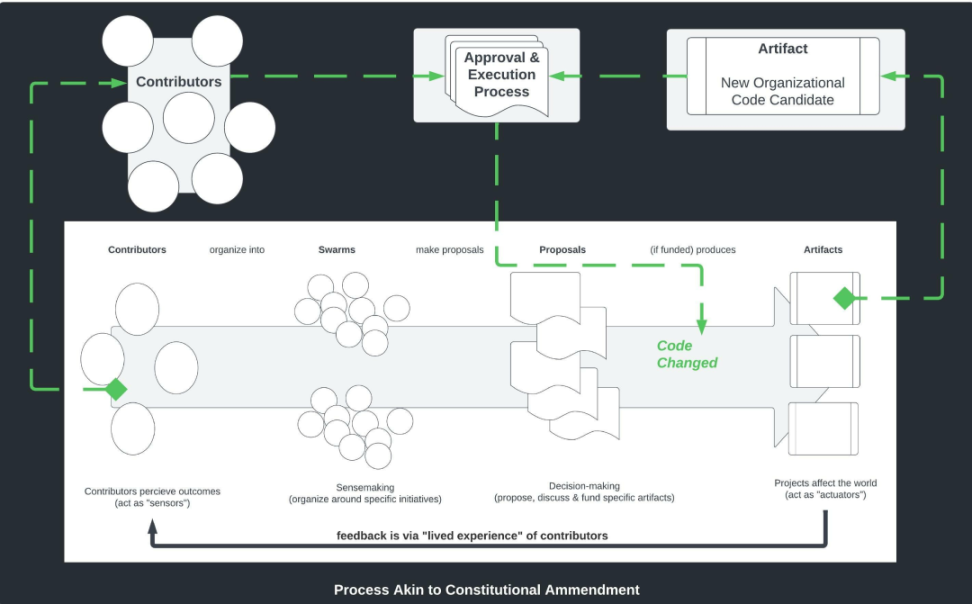在可行系统模型的语言中,治理是通过应用系统4和5的战略和治理功能来修改包含在系统3中的规则来构建组织,这反过来又规范了系统1和2的主要和协调功能。在去中心化系统中,参与者受制于行动领域,并负责在该领域进行塑造和迭代[31]。
