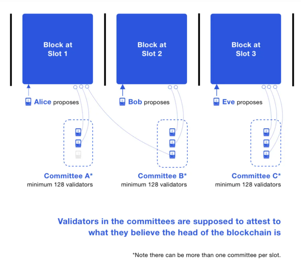 委员会是一组验证者。委员会的选取、提议者的设立、验证者的安排都是在称为 RANDAO 的伪随机过程中实现的。每个时隙有一个提议者和至少 128 个验证者组成的委员会。一个验证者每个周期只能在一个委员会中。通常,网络中有超过 8192 个验证者,从而保证每个时隙有两组委员会。