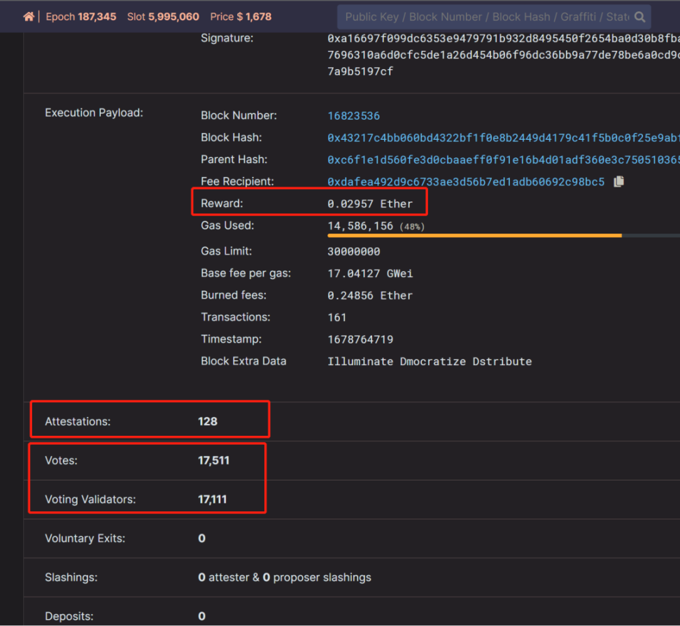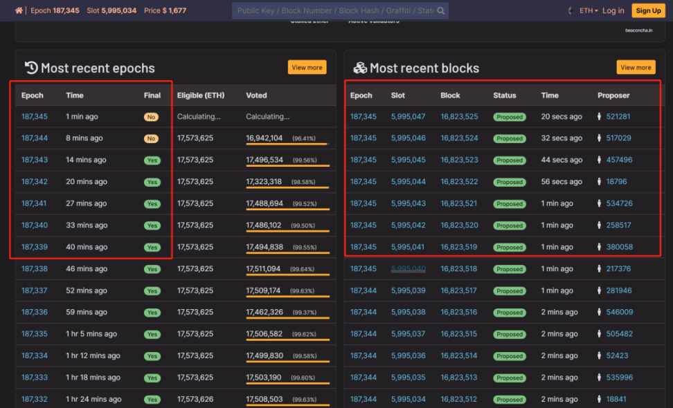 在信标链的区块链浏览器(https://beaconcha.in/)中,我们可以验证上述共识机制是否如上所述运行,并且进一步加深我们的理解。
