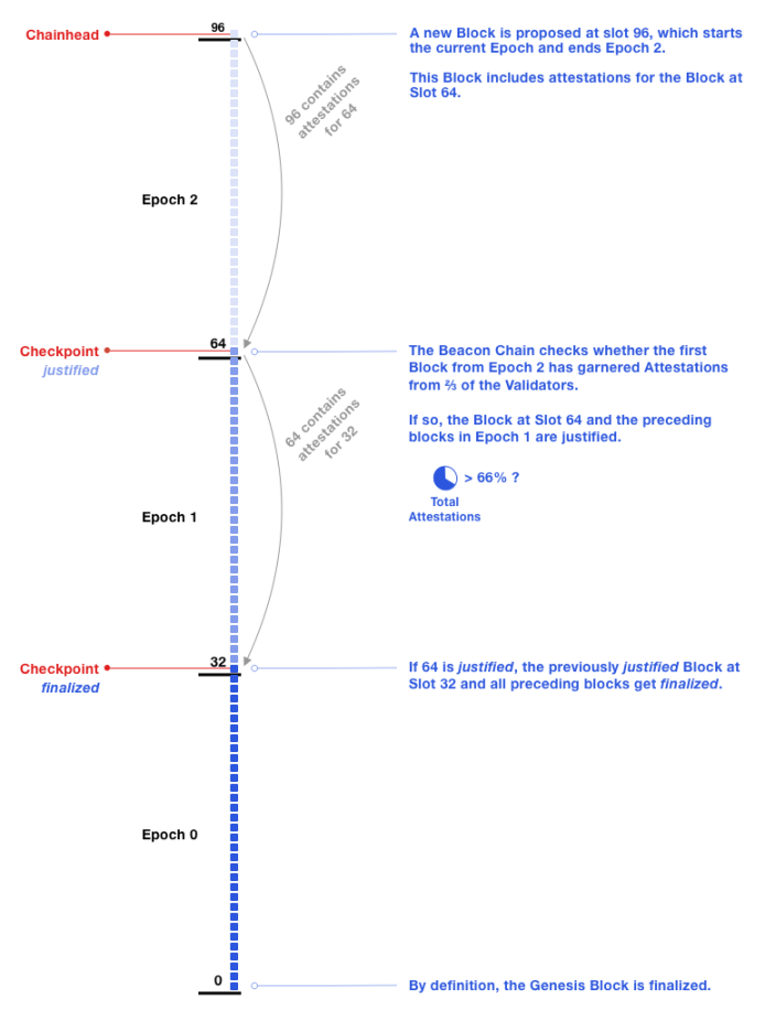 如果检查点 B 被证明是合理的,并且紧接的下一个周期中的检查点被证明是 justified 的,那么 B 将被最终确定为 Finality。通常,一个检查点会在两个时期内完成,即 12.8 分钟。