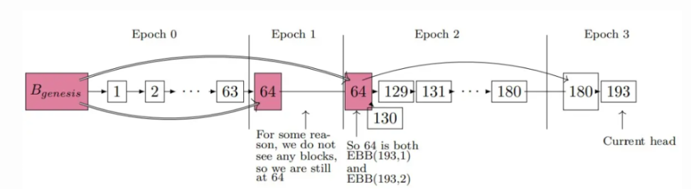 注意 Slot65 到 Slot128 没有区块。Epoch2 检查点应该是 Slot128 上的区块。由于缺少区块,Epoch2 检查点是仍然是 Slot64 上的区块。Epoch 3 的情况类似,Slot192 是空的,因此前一个块 Slot180 是 Epcoh3 检查点。