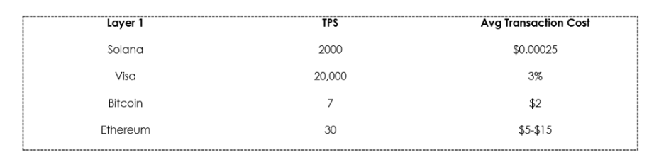 By implementing the payment rails on Solana, the prior problem of slow and expensive transactions can also be rectified. Solana is known as the potential “Visa of the digital asset ecosystem” because of its potential blazingly fast speed of 65,000 TPS. While it is currently averaging around 2000 TPS, it is still significantly higher than the other existing blockchains. Additionally, the average cost of a transaction on the Solana network is only $0.00025 which is significantly lower than the incumbents.