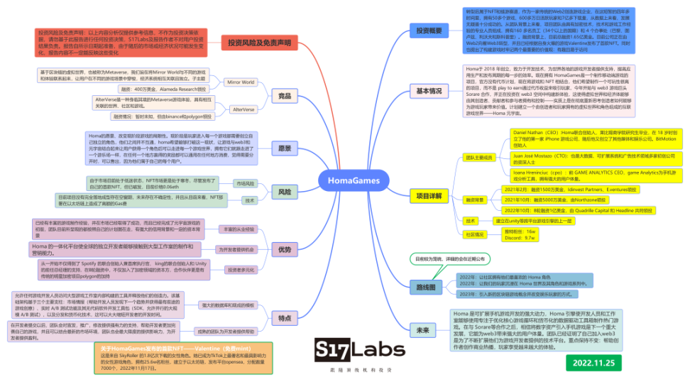 Homa Games 属于 NFT 和链游赛道,作为一家传统的 Web2 创造游戏企业,在这短暂的四年多时间里,拥有 50 多个游戏,600 多万日活跃玩家和 7 亿多下载量,从数据上来看,发展无疑是十分成功的。从团队背景上来看,项目团队由具有加密技术和游戏工作经验的专业人员组成,拥有 160 多名员工(34 个以上的国籍)和 4 个办事处(巴黎、图卢兹、利沃夫和斯科普里)。融资背景上,目前总融资 1.65 亿美金。目前公司正在由 Web2 向着 Web3 转型,并且已经根据自身火爆的游戏 Valentine 发布了首款 NFT。同时也提出了构建游戏时牢记两个最重要的价值观:有趣且易于访问。