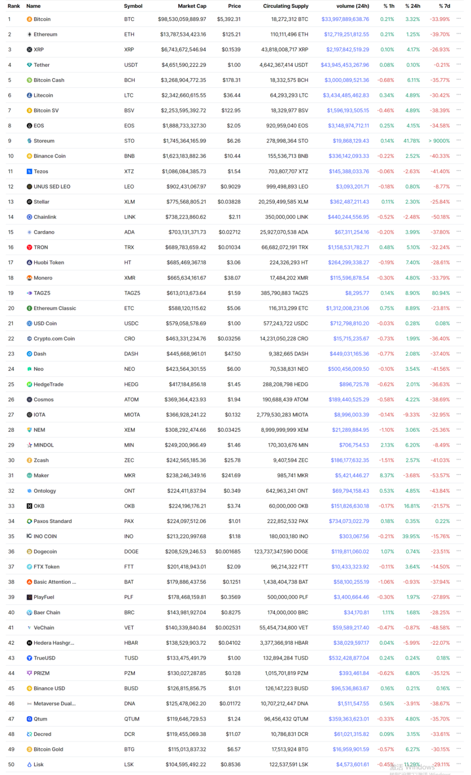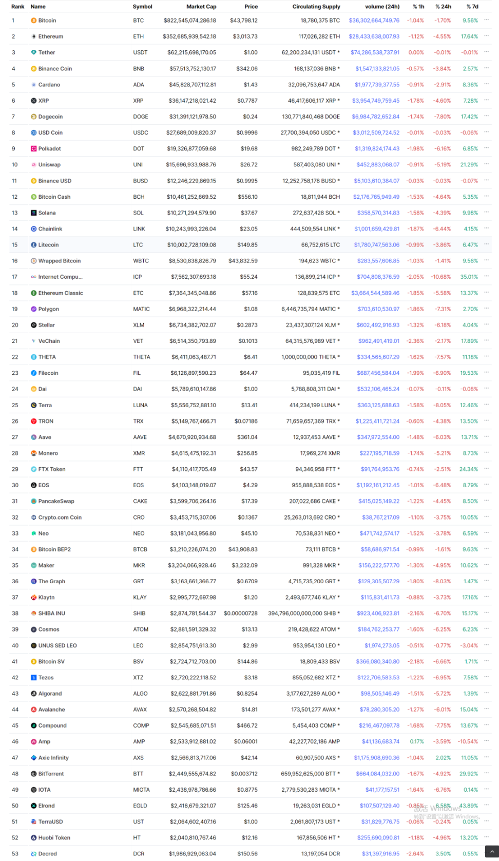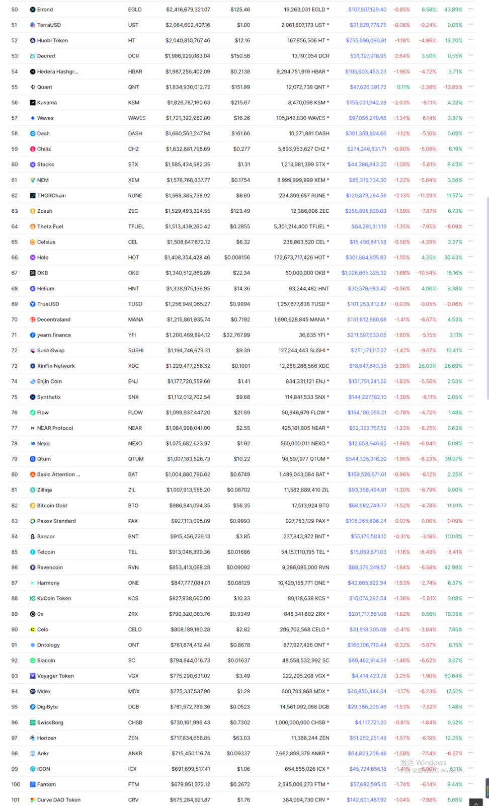 1.首先我们来看一下,2020 年 3 月 15 日,加密货币市场,前 100 的币种。再来看看 2021 年 11 月 8 日,市场巅峰时刻,加密货币市场,前 100 的币种。其中大家还认识多少?