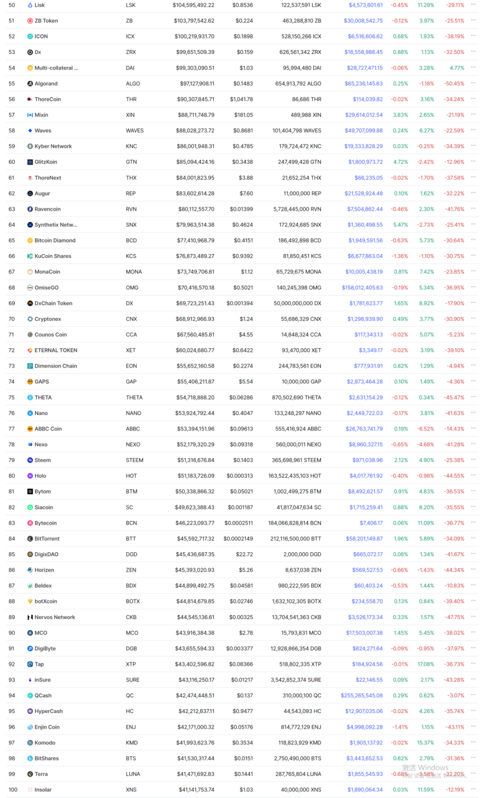 2020 年 3 月 15 日,加密货币前 100 的项目图表