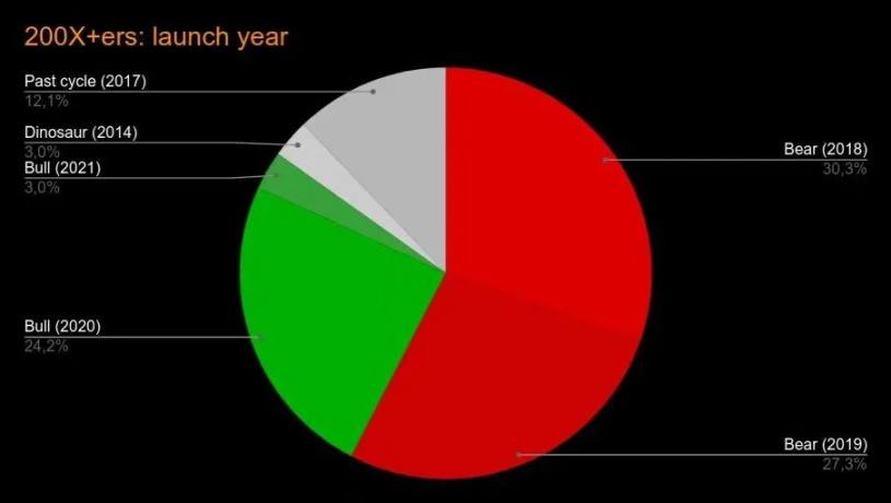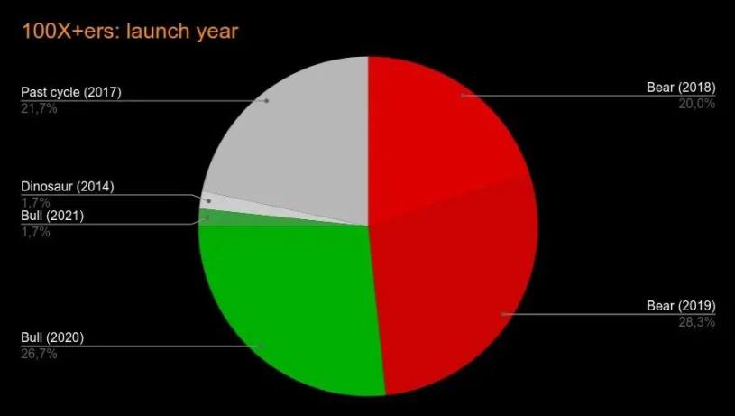 5.从项目成立时间看。100 倍项目中,76% 的项目是在 18-20 年熊市周期中成立,而只有 24% 是在 2017 年之前成立(上上个周期)。200 倍以上项目:85% 是在 2018 年、2019 年、2020 年创建。而 100 倍项目中,只有 1.7% 是在牛市晚期(2021 年)创建。所以从这个逻辑来看,22 年,23 年的项目,要多多关注。