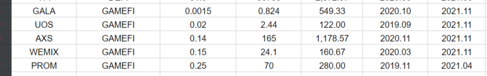 9.百倍币数量第二属于 GAMEFI,总共 5 个,占比 8.2%。GAME 一直是传统 WEB2 兵家必争之地,前有腾讯网易,后有米哈游。这个赛道最赚钱,也最赚流量。同时也是培养圈外用户进入 WEB3 的最好教育工具,只有人多共识强,加密货币市值不断新高,机构才能更好价格套现离场。所以机构也愿意投,自然是热点中的热点。
