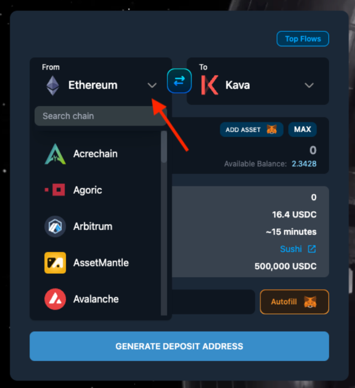 登陆Satellite Bridge ,在“From”下拉列表中选择您持有的 USDC 目前所在的网络,并在“To”下拉列表中选择Kava。