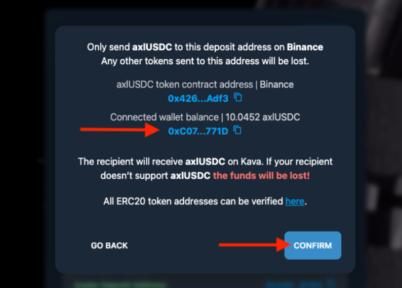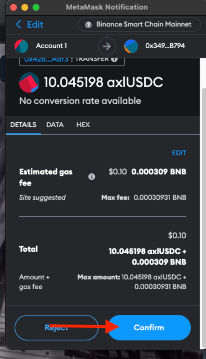 通过点击“Confirm”,以确认您正在发送 axlUSDC 到目标地址。