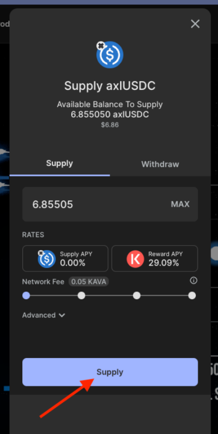 当您的 MetaMask 钱包收到 axlUSDC 后,即可前往Kava App供应 axlUSDC。仅需直接点击页面上方的“供应到 Lend”即可。