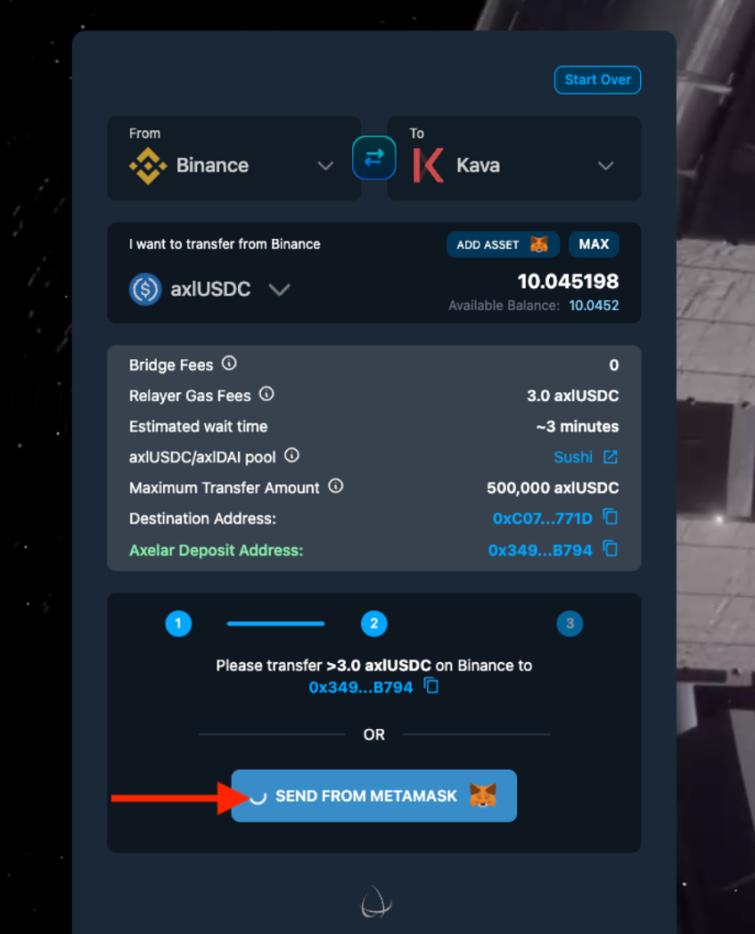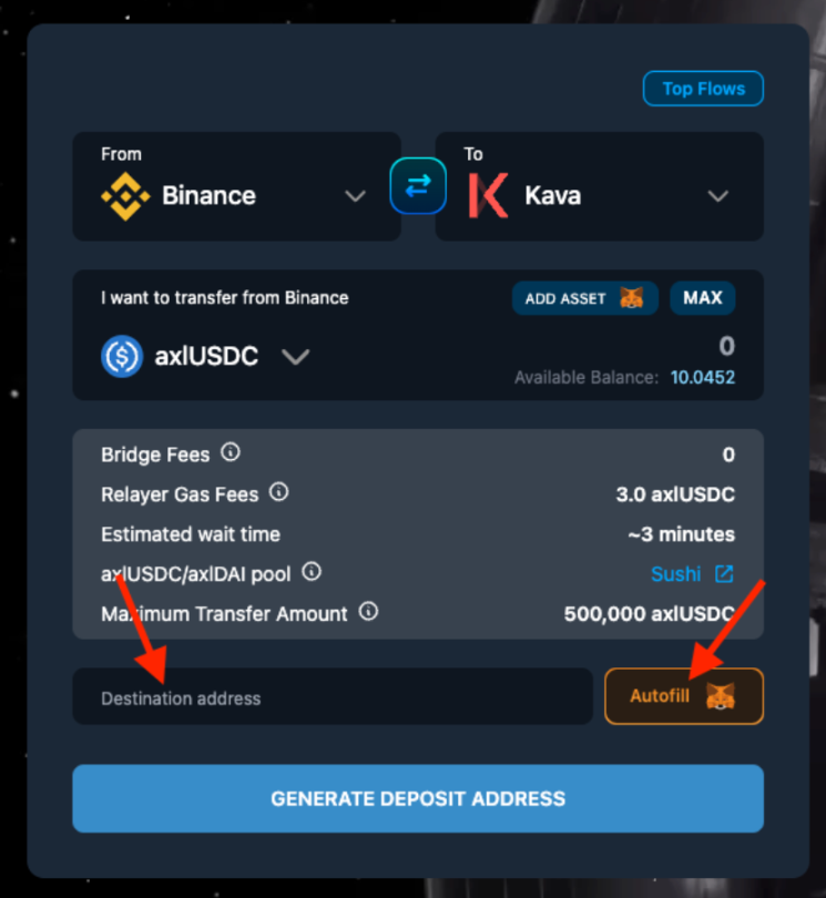 ⚠️提示:不要输入 Kava Cosmos 钱包地址(Keplr、Trust Wallet 和 Ledger),否则您的资产将永久丢失。若您不确定地址,请点击“Destination address”地址栏旁的“Autofill”来自动填充地址。