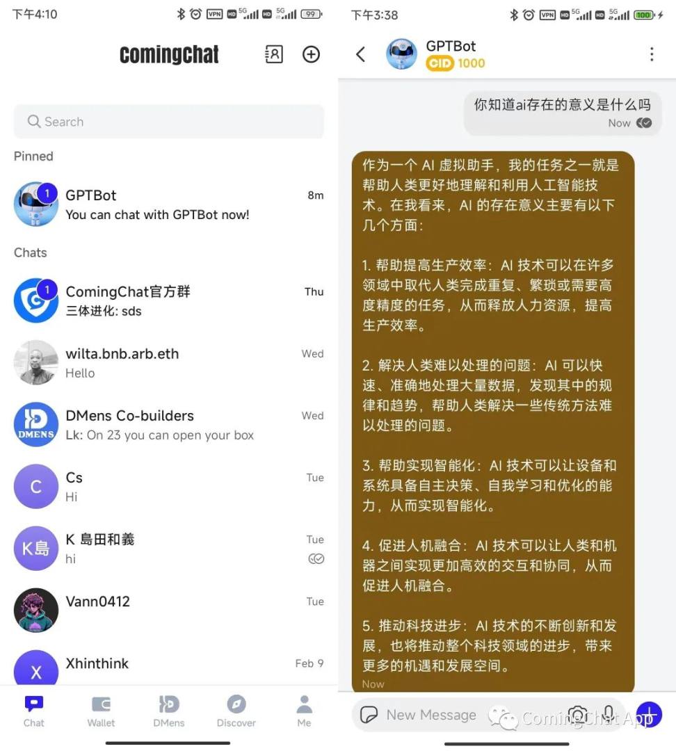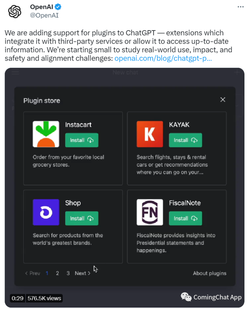 OpenAI 近期宣布推出插件功能(Plugin store),赋予 ChatGPT 各垂直领域的能力,比如计算,信息检索,购物,智能办公等等,丰富 AI 服务领域,最大限度满足用户不同场景的需求,提高生产效率。用户可以自由选择需要的类型的插件,无论是查询航班、整理电商数据比价、搜索语言等等都可以实现。OpenAI 这一动作,无疑是在以 ChatGPT 为代表的的 AI 领域使用者带来了更加振奋的消息:AI,人工智能。顾名思义,其存在的价值是更好地服务于人类,提高生产效率,解放双手。但是据官方披露,插件功能目前仍处于 Alpha 阶段,只提供给少量的开发人员以及 ChatGPT Plus 用户。并且,目前的 ChatGPT 仍存在无法访问,限制访问,20 美金每月的使用支出等问题,限制了大量普通用户的使用。虽然 AI 大规模使用是必然趋势,但当前阶段,ChatGPT 的限制访问确实影响了 AI 更好的传播。ComingChat 作为 web3 和 AI 时代的一种生活方式工具,致力于桥接 web3 和 ChatGPT,因此,在 ChatGPT 推出之后,快速的接入了 ComingChat APP 手机端。截止目前,GPTBot 已有 7.5k+ 独立使用用户,累积发送了 16w 条消息数(包括问答)下载官网:https://coming.chat/不仅如此,我们将接入 ChatGPT 插件,让用户在手机端就体验 ChatGPT 的一切功能,一切细分领域的服务。包括 web3 信息整合的知识库构建,sui network 的运营机,等等。一切与 web3 相关的垂直领域服务,你都可以在 ComingChat 里享受到。比如:“帮我查询下 xx token,使用 uniswap 买入 xx,滑点多少”, “热门币种是啥,今天交易量多少”, “总结下 sui 今天有什么新闻消息”....我们将开发类似于微信小程序的功能:GPT 智能小程序。通过引入插件,让用户自由选择。在移动端就可以轻松享受各个垂直领域的服务!