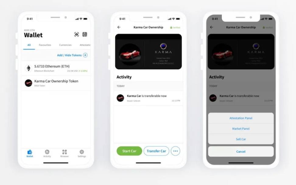 该 Token 可以放在任何加密钱包中。基于 TokenScript protocols, Karma Car Token 同时也化身为数字钥匙,可以解锁和启动汽车,以及了解车所在位置