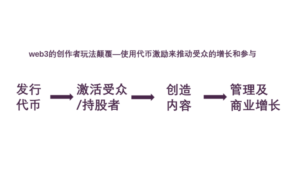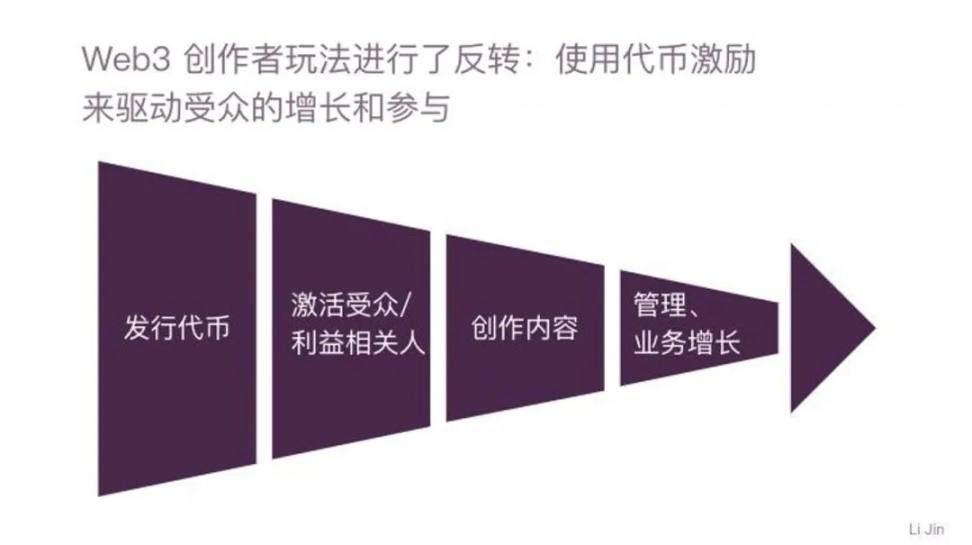 Web3 模式与 Web2 创作者的玩法模式恰恰相反。为了建立能够带来营收的庞大粉丝群体,Web3 创作者不需要先从创作免费内容开始,而是通过创建代币(NFT 或同质化代币)来直接营业。它会吸引那些对该资产的所有权所具有的潜在利益感兴趣的人,也即粉丝中的初始受众。然后,创作者可以利用从代币销售中获得的的初始资金,以及代币持有者群体来启动其创意工作。于是,这类粉丝也加入了游戏,见证创作者取得成功,并受到激励,甘愿充当成创作者及其作品的布道人。内容创作、受众增长和盈利的良性循环就这样开始了。