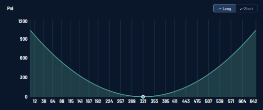 具体来说,当一个人做多 Gamma Swap 的时候,它的涨跌如下图所示:图中展示的是 BNB 的 Gamma Swap,BNB 当前价格为 321,接下来不管 BNB 是上涨还是下跌,该仓位都将获取正收益。