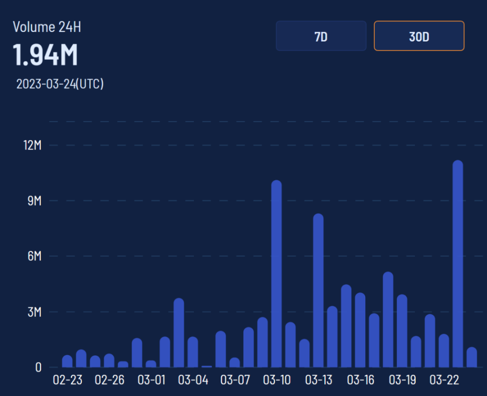 而从数据层面看,Deri Protocol 近 30 天的平均日成交量约 300 万美元,累计超过 1406 亿美元,但流通市值仅有 524 万美元(CoinGecko 的 3 月 24 日数据),可以说是 Arbitrum 链上最被低估的项目之一——相比 GMX、GNS 数亿美元的市值简直是最具性价比的种子选手。