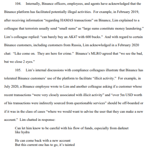 CFTC 的文件中包含了一些对 Binance 最具破坏性的指控:Binance 可能故意为有组织犯罪和恐怖组织的交易提供便利。CFTC 引用了 Binance 的内部聊天记录,其中包括当时的首席合规官 Lim 和一名洗钱报告官的对话。