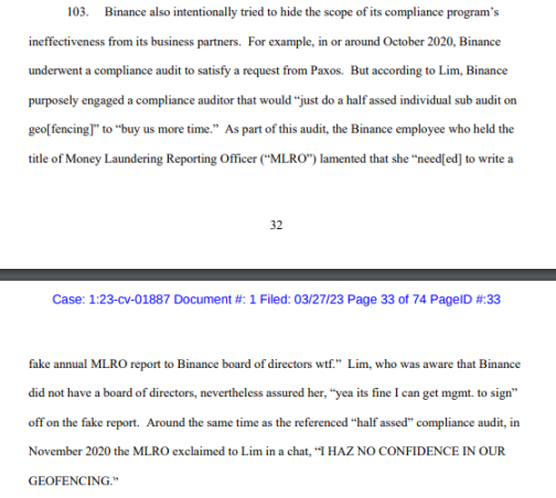 “但根据 Lim 的说法,Binance 故意聘请了一名合规审计员,该审计员 ‘只对地理进行评估的个人审计’,以 ‘为我们争取更多时间’,”CFTC 在诉讼报告中写道。