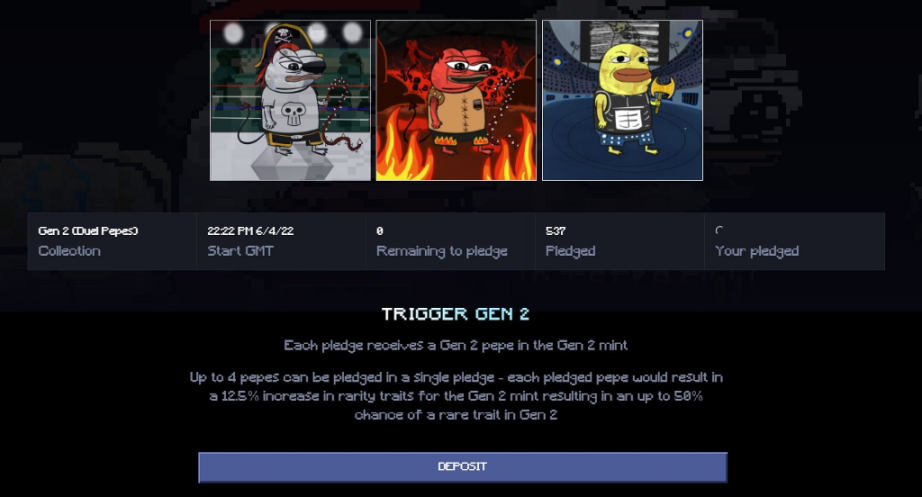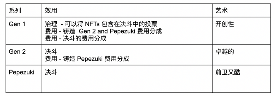 Gen 2 Pepes 不仅可以互相战斗,还可以与其他项目决斗。这可以通过 Gen 1 持有者来实现,他们将能够在不同的项目中投票,以允许这些 NFT 进入战场。