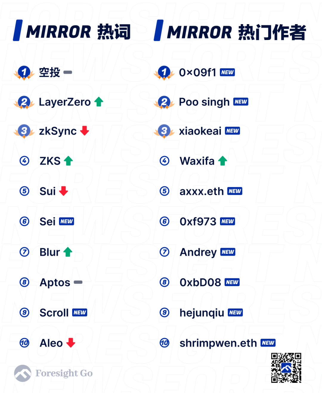 Mirror 热词排行榜上像「zkSync」、「Sei」、「Scrool」等空投种子选手也悉数上榜,而 Mirror 作者排行榜本周同样受 Arbitrum 空投的影响,「空投教程」类再次达 8 人之多。
