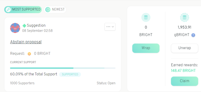 下图是Bright DAO的投票。很多人都拿到过Bright DAO的空投,如果你把\(Bright拿去投票,是有奖励的。我一个月奖励了148.47个\)Bright。