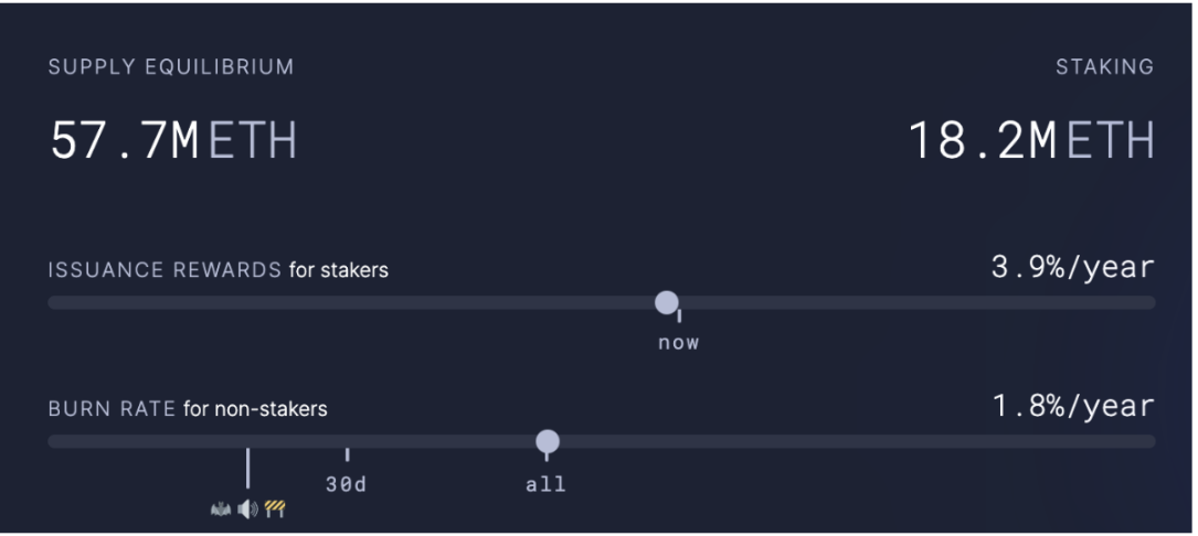 在市场交易不够活跃的熊市中,以太坊供应量增长逐渐平缓并有下降趋势,可以预计到,牛市的到来,交易量的大幅上涨,消耗 gas 费的提高,会进一步加快以太坊的通缩。而以太坊质押率会在供应量通缩的背景下走高,然而随着以太坊的质押率不断提高,单个节点的质押收益率随之降低,在以太坊质押率达到一定值时会进入两者间的动态平衡状态。