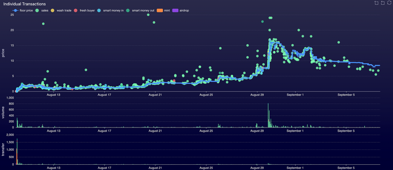 Potential wash trading activities are one notable risk since the NFT’s launch, as seen in the transaction spike in August 29.
