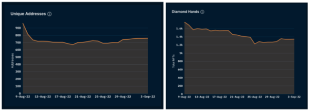As noted in the graph on Individual transactions (from DegenKnows) above, we noticed a sudden increase of transactions on August 29, leading to the surging NFT floor price and trading volume. However, we have not identified a corresponding increase in unique addresses and diamond hands (holders that have not sold or give away anything for his DigiDaigaku NFTs).