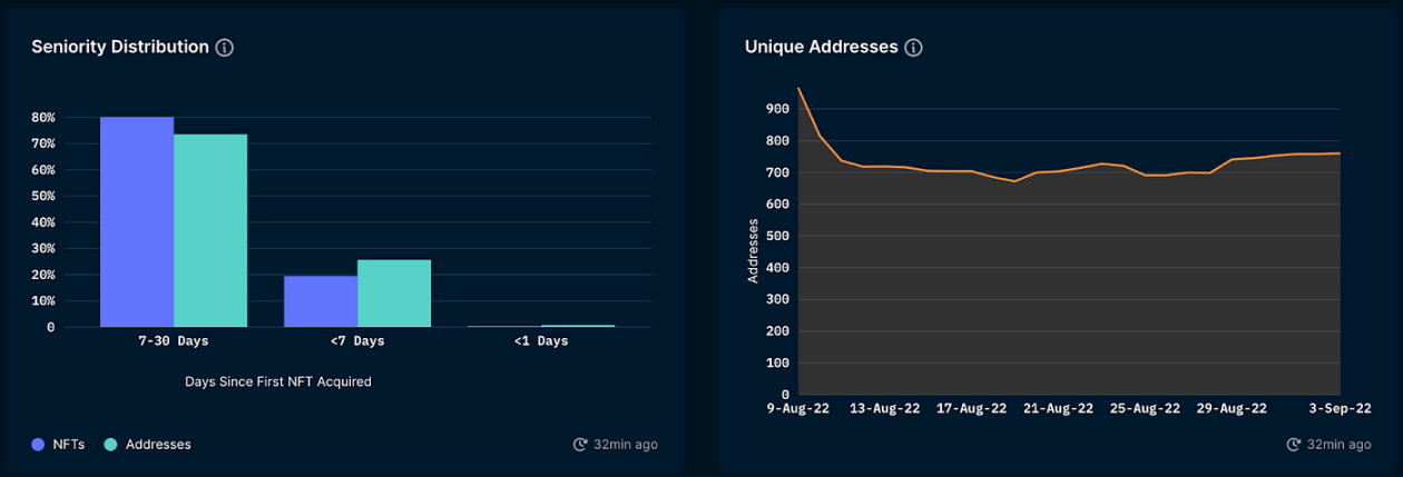 This may imply the surging NFT floor price can be pumped by market makers, whales or even the founding team. However, these activities were not identified as wash trades. Compared to initial launch on August 11 (Floor price: 1.83 ETH) and August 25 (Floor price: 5.23 ETH), there were significant decrease in unique addresses and diamond hands, meaning that some users took profits after their free mint.