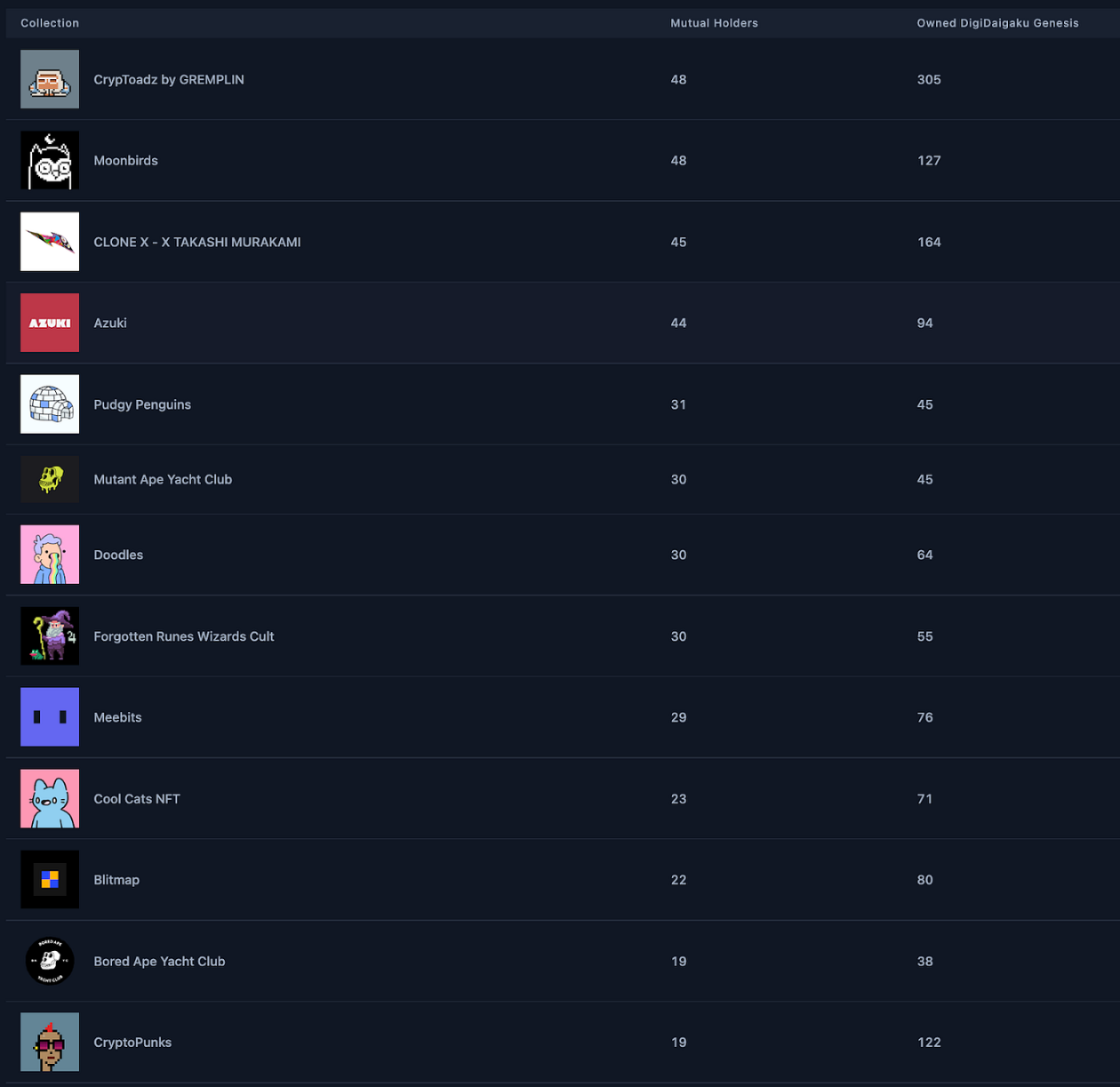 Mutual NFT collections vs DigiDaigaku (As of Sep 3)
