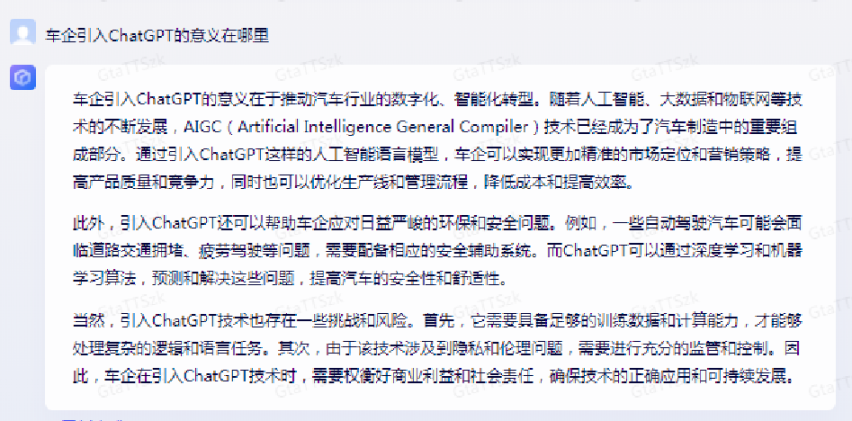 在这个智能电动车时代,每一家车企深怕自己错过了这个风口,在 ChatGPT 受到高度关注伊始,就开始积极研究引入相关的产品。但究竟 ChatGPT 或者其他 AIGC 工具能给车企带来什么呢?我们先来看看 ChatGPT 自己的回答。