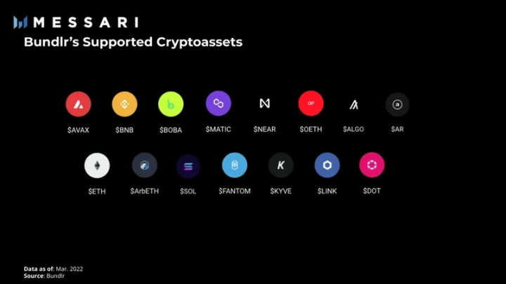 Bundlr与以太坊二层解决方案Arbitrum的最新合作,允许以太坊用户在Arweave上永久存储他们的数据,并使用ETH来支付上传。Bundlr目前支持以下加密资产的支付,并不断增加对更多加密资产的支持。