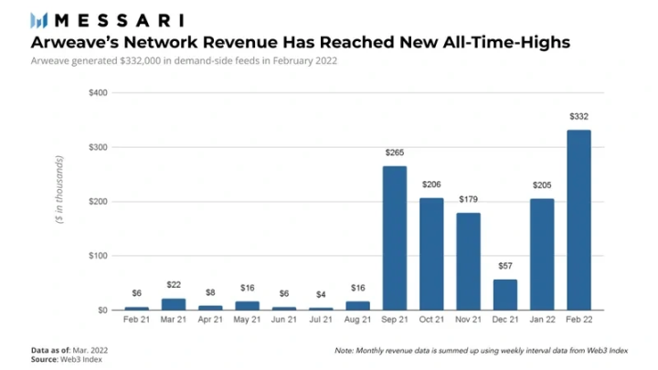 随着permaweb生态系统的不断发展,Arweave的网络收入达到了历史新高。根据Web3 Index,Arweave在2月份产生了332,000美元的需求方费用。