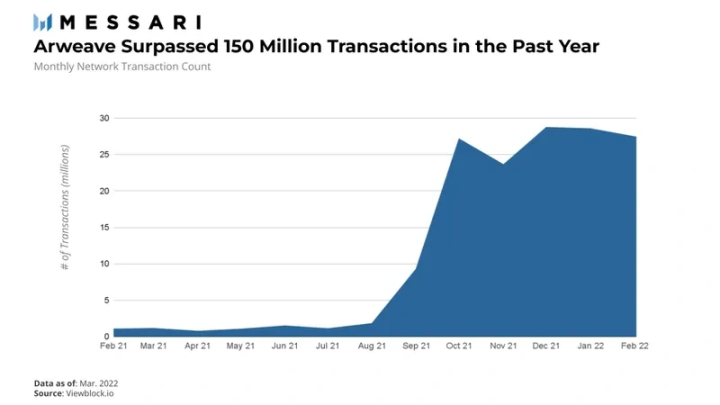 在过去的一年里,Arweave处理了超过1.5亿次交易,其中70%来自Bundlr Network。链上交易同比增长了2600%。