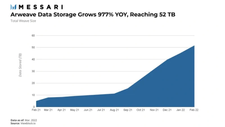 截至2022年2月,Arweave的总编织规模同比增长977%,达到52TB的数据存储量。Bundlr在增加Arweave的链上数据存储方面发挥了至关重要的作用,占总编织规模的70%以上。