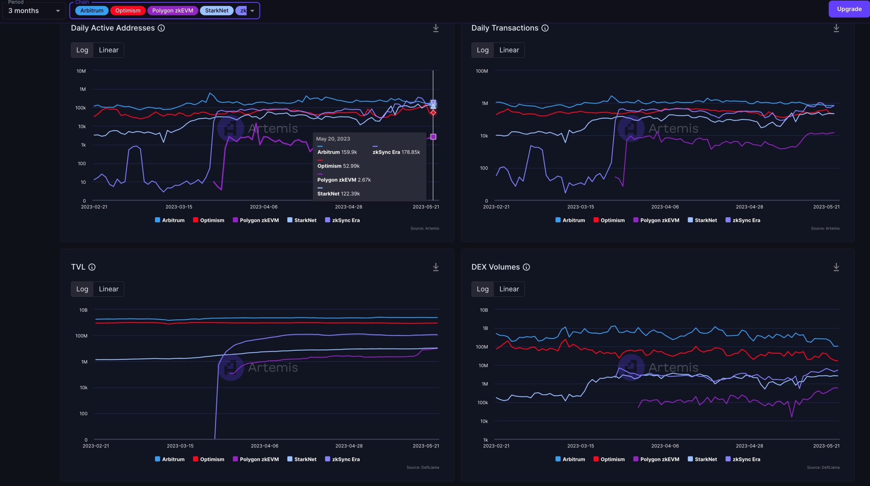 根据 artemis 显示,5 月 20 日 L2 链上数据如下: 在潜在空投预期下,当日 zkSync Era 链上活跃用户数与链上交易次数和 Arbitrum 相近,有 17.89 万用户贡献了 66.37 万笔交易;