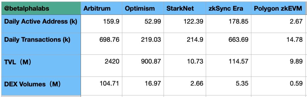 但从 TVL 和 Dex 交易量来看,zkSync Era 和 StarkNet 要远低于 Arbitrum 和 Optimism,尤其是 StarkNet,这也印证了绝大多数用户是采用几十刀以内的地址进行 StarkNet 和 zkSync 链上交互;而 Arbitrum 和 Optimism 则是人均几百或近千刀链上交互。