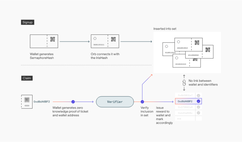 值得一说的是,通过采用 ZKPs 技术,Worldcoin 账户可实现不与 Orb 的相关数据关联。当用户使用其 World ID 时,零知识证明(ZKP)可以防止第三方知道这个人的钱包公钥或跨应用程序跟踪这个人。ZKP 还保护 World ID 的使用不与任何生物特征数据或个人虹膜代码绑定。