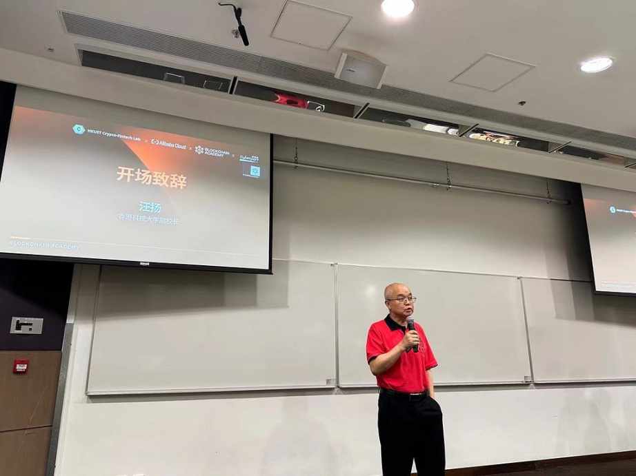 香港科技大学副校长汪扬教授进行开场致辞,对到场的嘉宾及同学们表示热烈欢迎,他指出香港科技大学将会全力推动 Web3 在香港的普及,帮助香港成为亚洲乃至全世界的 Web3 中心,为亚洲年轻人开启未来之门。
