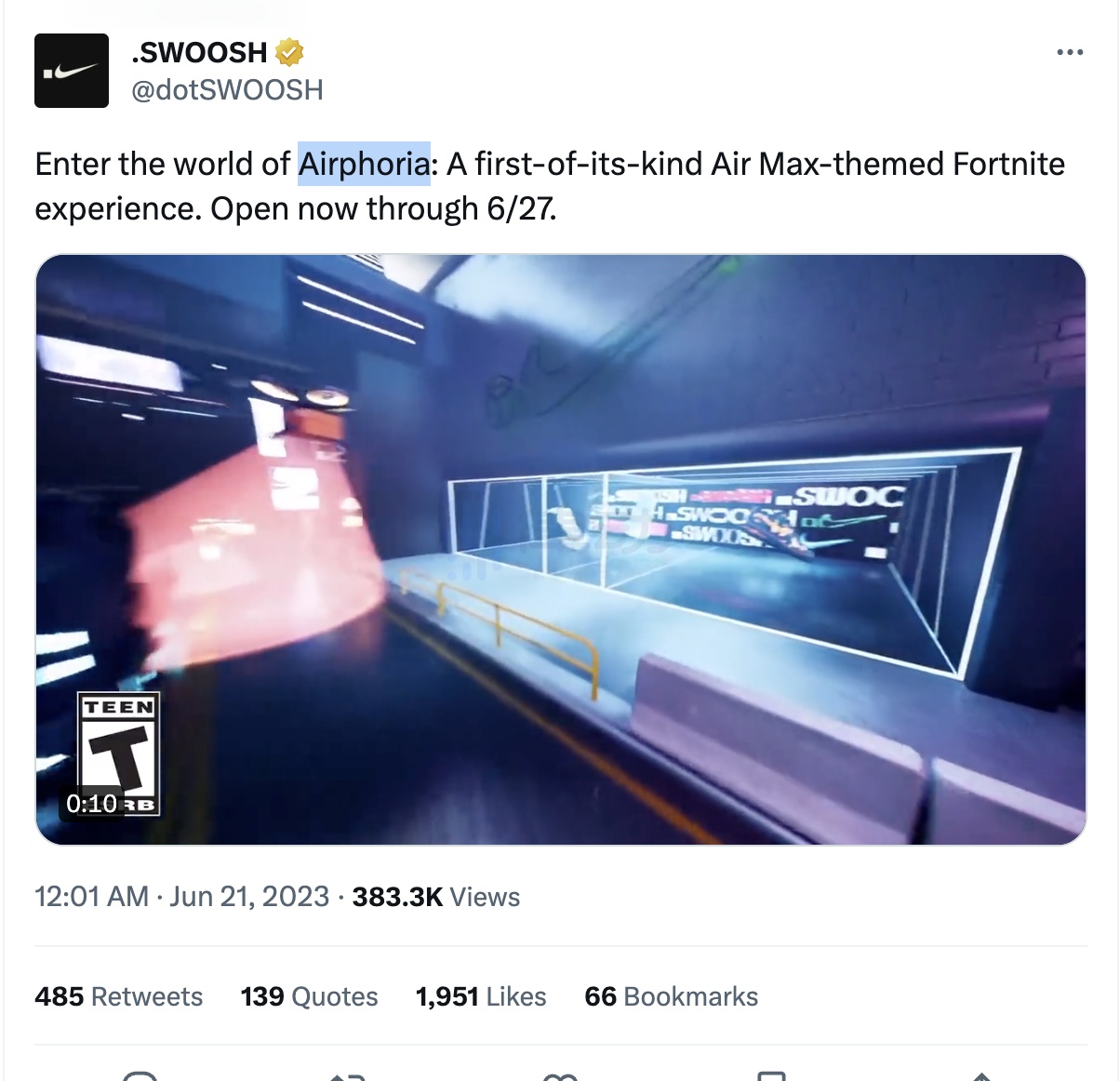 Nike 旗下 NFT 平台 .SWOOSH 和《堡垒之夜》合作的以 Air Max 运动鞋为灵感的元宇宙 Airphoria 并非提及 NFT 这样的字眼。