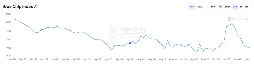 NFTGO 的数据显示,过去 3 个月,NFT 市场整体市值大幅下降了 23.64%,从 510 万 ETH 一路跌至 390 万 ETH。除了 5 月 31 日和 6 月 5 日之间的短暂反弹,NFT 蓝筹指数总体上呈现下降趋势——从 8.5 万 ETH 下降到 7.5 万 ETH,下降了 12.22%。