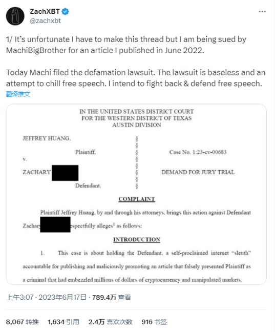 黄立成指出,ZachXBT 在一年前发布的调查文已损害其名誉,因此他已在美国德州地方法院对 ZachXBT 提起诽谤诉讼。他表示:我一直认为他在文章中的指控并不属实。我期待通过诉讼来证明 ZachXBT 已对我构成非法诽谤。