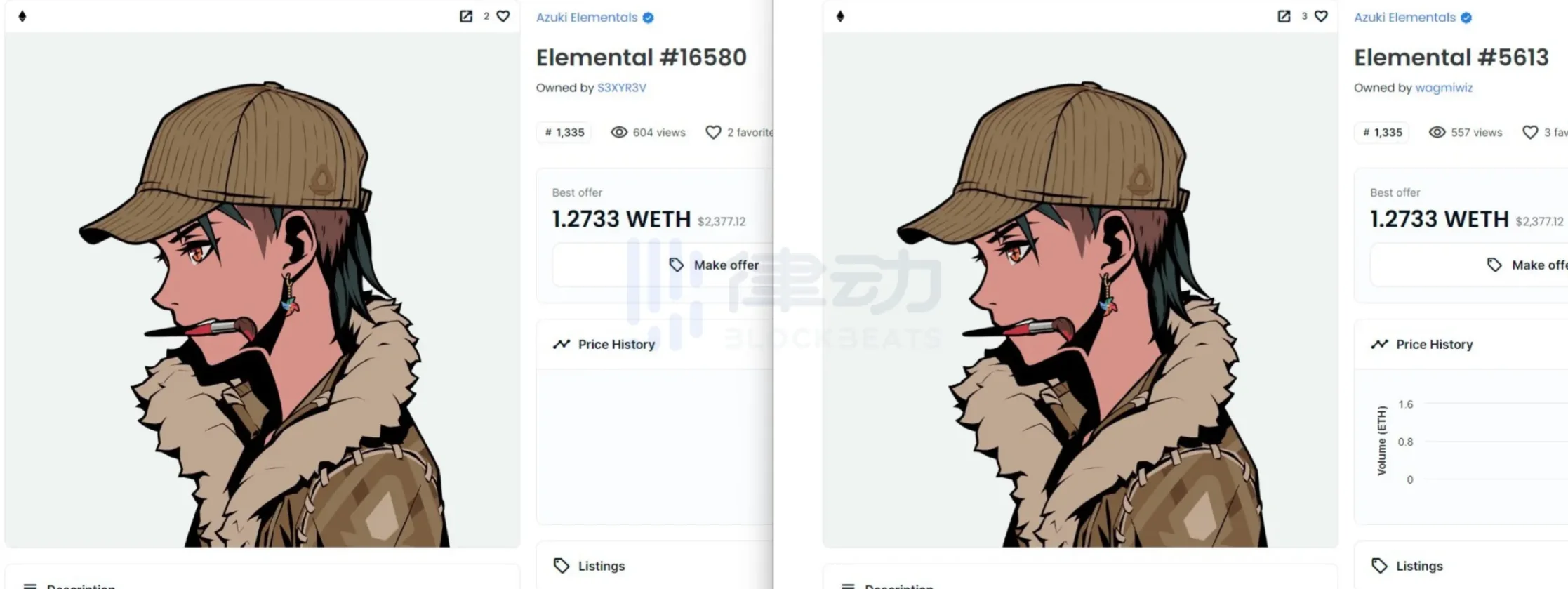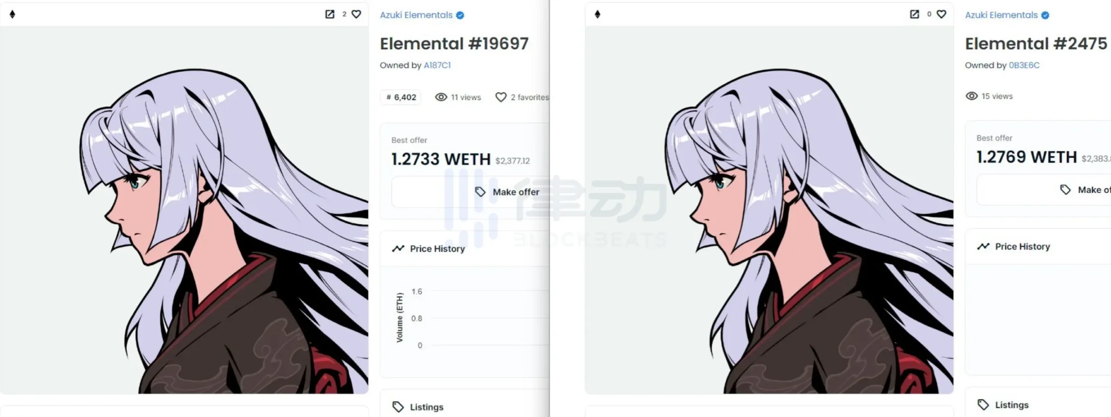 一开始社区质疑的是 Elements 与 Azuki 的高度重合性,然而随着开图的 Elements 越来越多,竟有不少持有者发现自己的 Elements 与其他持有者的长得一样,不是高度重合性,而是完全一模一样。