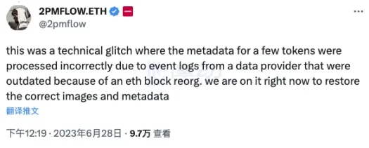 随着 Elementals 开图时被发现撞图情况越来越多,团队才意识到这个问题并做出回应。Azuki 联合创始人 2PMFLOW 在社交媒体上回复社区表示,该情况系技术故障,由于数据提供商的事件日志因以太坊区块重组而过时,导致少数 Token 的元数据被错误处理。团队正在努力恢复正确的图像和元数据。