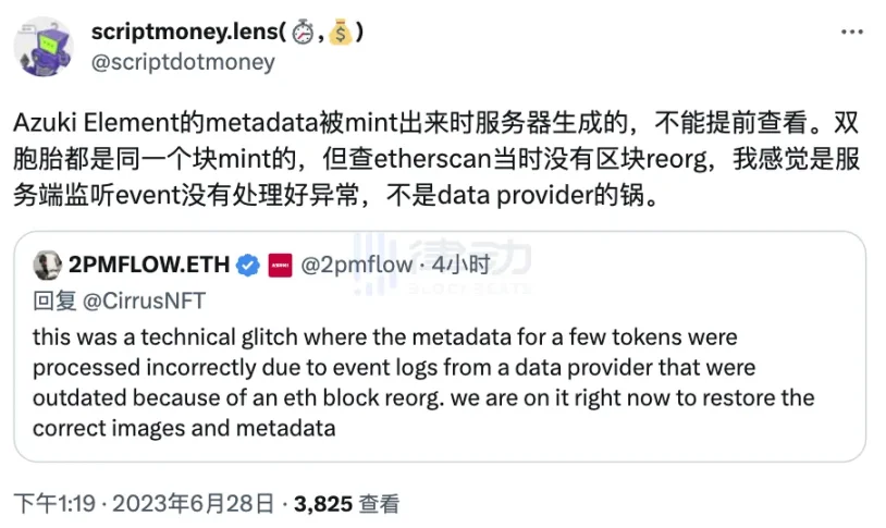 对于 Azuki 联合创始人 2PMFLOW 给出的「撞图情况因以太坊区块重组,系技术故障」的回复,cryptochasersco 创始人 scriptmoney.lens(@scriptdotmoney) 无法苟同,他在社交媒体上提出了自己的看法:发生撞图情况的原因是服务端监听 event 没有处理好异常,不是数据提供者。言外之意,Azuki 所说的撞图情况系技术故障似乎无法自洽。
