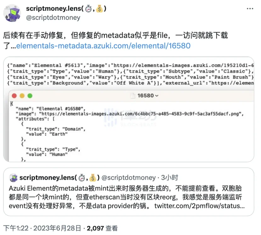 针对 Elementals 铸造和开图的问题,Azuki 联合创始人 2PMFLOW 针对 Elementals 开图出现相同图像在社交媒体上回复社区表示团队正在努力恢复正确的图像和元数据。而随后 BlockBeats 也发现,在查询 Elementals 系列合约时,部分 NFT 的 tokenURL 已无法显示查询结果。同时,Elementals 系列部分 NFT 预览图在 Blur 等 NFT 交易平台也无法正常显示。Azuki 团队就这样在社区的眼前来了一次实时「换图直播」。
