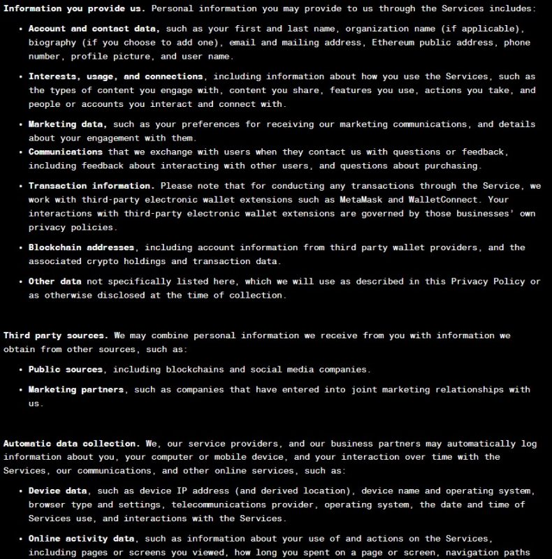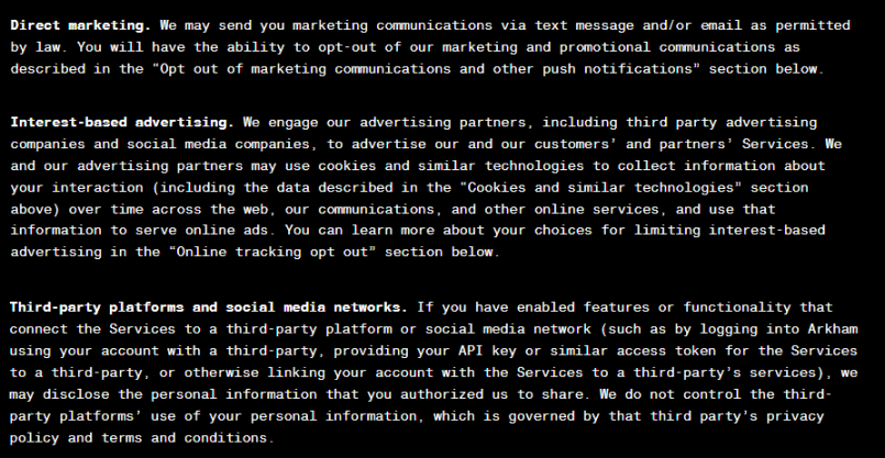 在注册时的隐私政策声明中,Arkham 也标明他们可以利用电子邮件进行直接营销、基于兴趣的广告推送、共享第三方平台和社交媒体网络的信息。