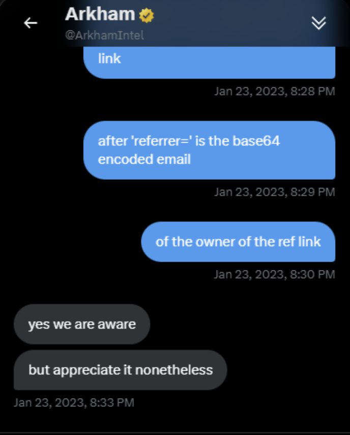 Arkham 首席执行官 Miguel Morel 在社交媒体发文回应称,「该系统是在测试版开始时创建的,目的是能够通过电子邮件跟踪用户推荐,以奖励用户,除了与用户沟通和追踪推荐之外,我们不会将它们用于任何其他目的。今后所有推荐链接都将包含推荐人电子邮件的加密版本,因此无法对其进行逆向工程,此更改已经生效。」