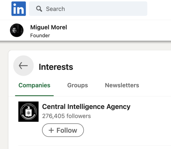 此外,人们在其领英主页上发现,Miguel Morel 的兴趣是美国的中央情报局(CIA)。